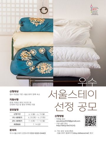 ‘우수 서울스테이’ 지원은 6월 5일부터 6월 19일 17시까지 전자우편 또는 구글폼을 통해 접수 가능하며, 신청 대상은 접수 마감일까지 서울 스테이 숙소 등록을 완료한 외국인관광 도시민박업 및 한옥체험업이다.