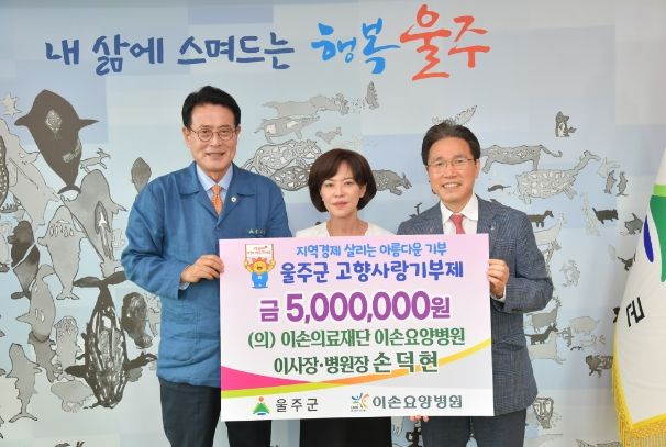 한편 고향사랑기부제는 개인이 현재 주소지를 제외한 지방자치단체에 연간 500만원까지 기부하면 세액공제와 기부금의 30% 이내 답례품을 받을 수 있는 제도로, 울주군에는 손덕현 이손요양병원 이사장, 손부홍 부산 사상제일요양병원장, 가수 박군, 새울원자력본부 노동조합 등 각계각층의 고향사랑기부가 이어지고 있다.