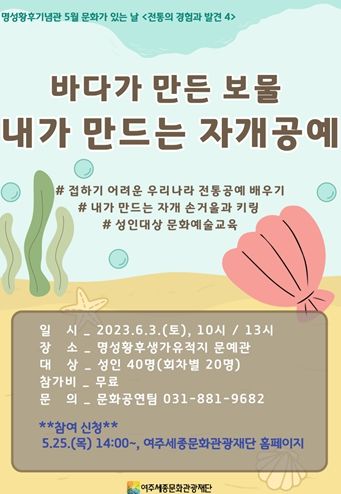 [제주교통복지신문 김강석 기자] 여주세종문화관광재단은 오는 6월 3일 명성황후기념관 5월 문화가 있는 날 프로 그램으로‘바다가 만든 보물, 내가 만드는 자개공예’를 진행한다.