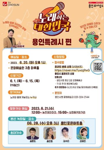 참가신청은 용인특례시청 문화예술과와 각 읍·면·동 행정복지센터에서 할 수 있으며, 용인문화예술원 마루홀에서 6월 20일 오후 1시에 열리는 예심 현장에서도 신청 가능하다.
