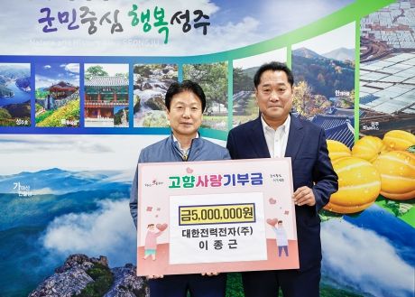[제주교통복지신문 김강석 기자] 성주군은 지난 5.30일, 대한전력전자(주) 대표 이종근씨는 성주군에 고향사랑기부금 최고액인 500만원을 기부했다.