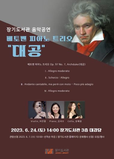 [제주교통복지신문 김강석 기자] 김포시립 장기도서관은 오는 24일 오후 2시 바이올리니스트 이인영, 피아니스트 김지수, 첼리스트 유예림 트리오의 ‘대공 연주회’를 개최한다.