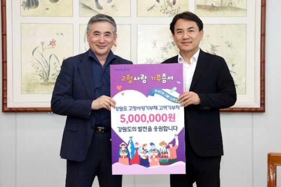 [제주교통복지신문 김강석 기자] 강원도는 6월 1일, 바인그룹 김영철 회장이 강원도를 직접 방문해 강원도지사에게 고향사랑 기부금을 전달했고, 그 자리에서 강원도 고향사랑기부제 홍보대사로 위촉했다고 밝혔다.