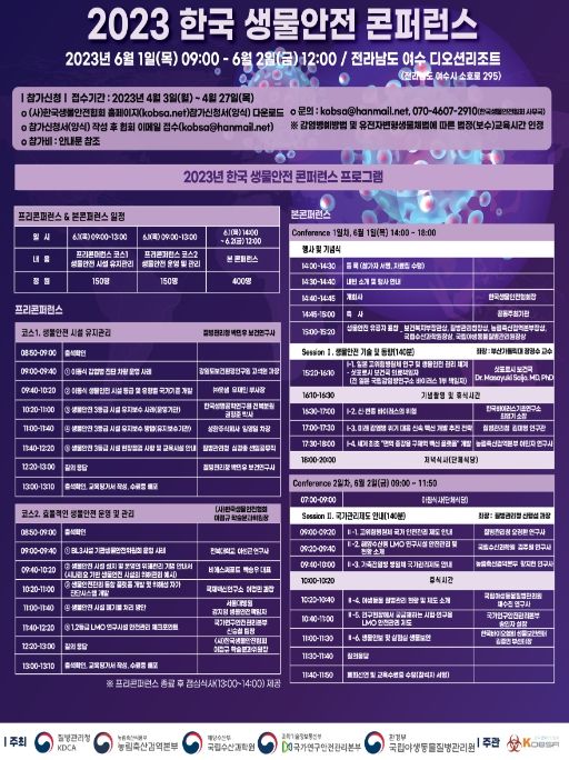 [제주교통복지신문 김강석 기자] 농림축산검역본부는 병원체 등의 안전관리 문화 확산과 민관 협력체계 강화를 위해 6월 1일부터 이틀간 전남 여수시 디오션리조트에서 ‘2023년 한국 생물안전 학술대회(콘퍼런스)’를 공동 개최한다.