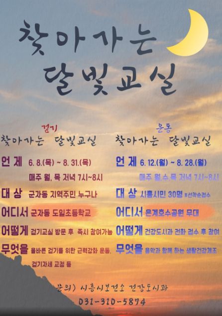 ‘찾아가는 달빛 운동교실’은 지역주민 30명을 선착순으로 모집한다. 참여를 희망하는 사람은 시흥시보건소 건강도시과로 신청하면 된다.
