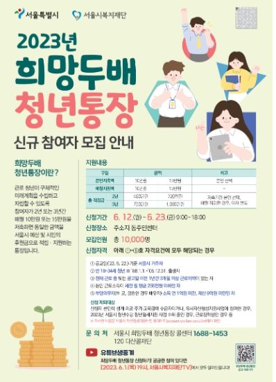 희망두배청년통장과 꿈나래통장 가입은 이달 12일부터 23일까지 주소지 동주민센터 직접 방문이나 우편, 전자우편으로 하면 된다.