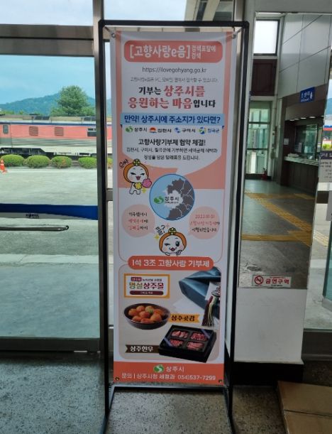 [제주교통복지신문 김강석 기자] 상주시는 김천․구미․칠곡과 맺은 고향사랑 기부제 활성화 협약을 이행하기 위해 관내 행정복지센터에 팸플릿·현수막 배부, 버스정류장·기차역·고속도로 휴게소 등에 공동 홍보 배너를 설치했으며, 협약 시·군의 홍보자료를 옥외 대형전광판과 전자시민게시판을 활용하여 5월 말부터 홍보하고 있다.