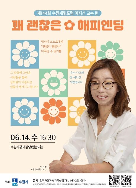 수원시는 6월 14일 오후 4시 30분 시청 대강당에서 ‘꽤 괜찮은 해피엔딩’을 주제로 ‘제144회 수원새빛포럼 이지선 교수 편’을 개최한다.