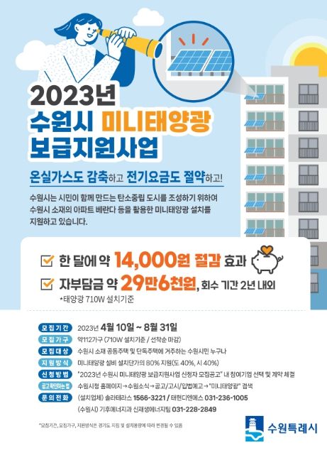 수원시 관계자는 “미니태양광 보급지원사업이 온실가스 감축에 도움이 될 것”이라며 “신재생에너지를 생산하는 친환경 태양광발전 설비를 많은 가정에서 설치하길 바란다”고 말했다.