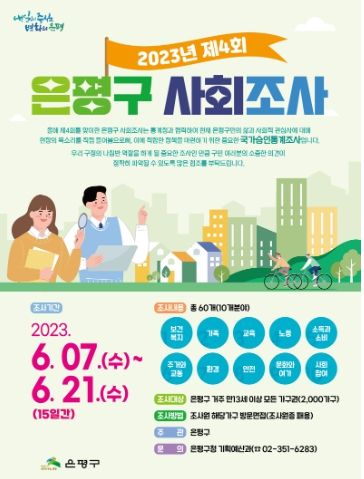 [제주교통복지신문 김강석 기자] 서울 은평구는 주민 맞춤형 정책 수립을 위해 구민 생활 전반에 대한 실태를 파악하는 ‘2023년 은평구 사회조사’를 이달 7일부터 21일까지 추진한다.