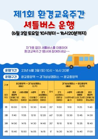 [제주교통복지신문 김강석 기자] 셔틀버스는 광교중앙역, 수원시청역, 수원역, 경기도 업사이클플라자를 연결하는 경로로 운행되며 매주 토요일과 일요일 각각 4회씩 운영된다. 출발 시간은 광교중앙역에서 오전 10시부터 시작해 경기도 업사이클플라자까지 약 40분 간격으로 4회 왕복 운행한다.