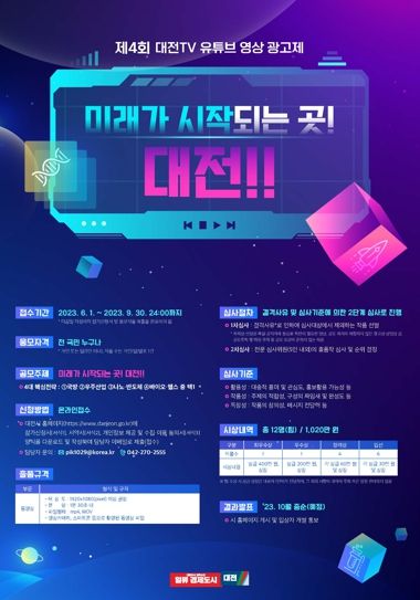 공모 주제는 ‘미래가 시작되는 곳! 대전!’이며, 대전의 4대 전략산업인 ▲국방산업 ▲우주항공산업 ▲나노·반도체산업 ▲바이오·헬스 사업 중 1개 사업에 대한 광고영상을 제작 출품하면 된다.