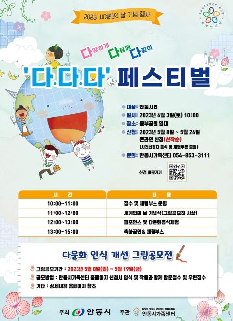 [제주교통복지신문 김강석 기자] 안동시와 안동시가족센터는 오는 6월 3일(토) 10:00 웅부공원에서 세계인의 날 기념행사 (부제: 다·다·다 페스티벌)를 개최한다.