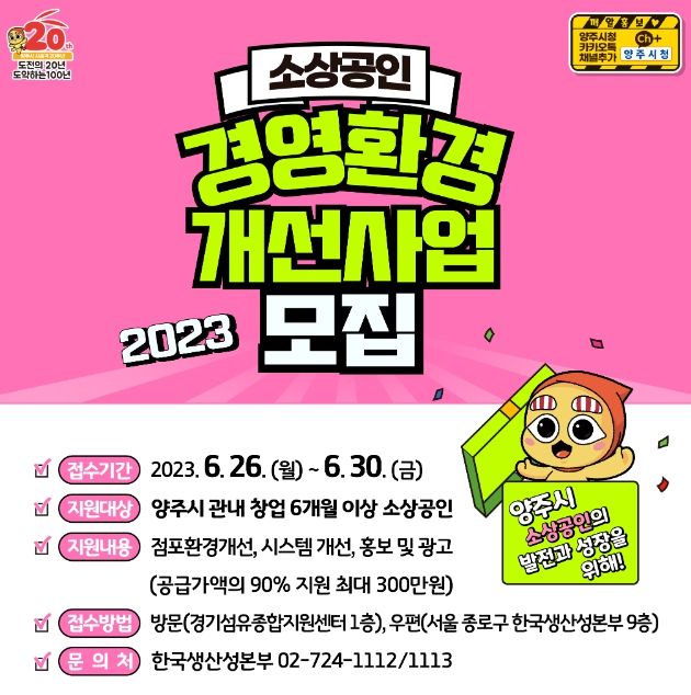 공고 마감일인 오는 30일 기준으로 양주시에 사업장을 두고 창업 6개월 이상 영업 중인 ‘소상공인 보호 및 지원에 관한 법률’ 제2조에 따른 소상공인 사업자라면 누구나 신청할 수 있다.