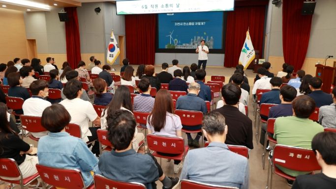 [제주교통복지신문 김강석 기자] 과천시가 탄소중립 실현을 위해 다양한 정책을 추진하고 있는 가운데, 탄소중립에 대한 직원들의 이해를 높이기 위해 지난 1일 시청 대강당에서 열린 ‘직원 소통의 날’에 탄소중립을 주제로 특강을 실시했다.