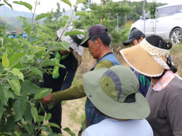 봉사에 앞서 작목 담당자로부터 사과 열매솎기 방법 및 주의사항을 전달받는 등 작업내용을 사전에 숙지한 후 현장에 나섰다.