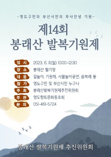[제주교통복지신문 김강석 기자] 봉래산 정상에 일제가 박아놓은 쇠말뚝을 제거한 날을 기념하고, 영도의 번영과 구민의 무사안녕을 기원하기 위한 “제14회 봉래산 발복기원제”가 오는 6월 11일 오전 10시에 봉래산 헬기장에서 개최된다.
