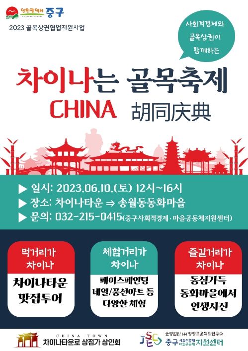 [제주교통복지신문 김강석 기자] 인천 중구 사회적경제·마을공동체 지원센터는 오는 10일 정오부터 차이나타운과 송월동 동화마을 일대에서 ‘사회적경제와 골목상권이 함께하는 '차이나는 골목축제' 시즌 3’ 행사를 개최한다.