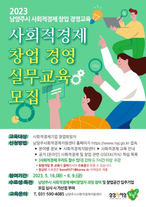 [제주교통복지신문 김강석 기자] 남양주시는 오는 6월 20일부터 7월 28일까지 남양주시 사회적경제 지원센터에서 ‘2023 남양주시 사회적경제 창업 경영 실무교육 과정’을 주 2회 총 10차시로 운영한다고 2일 밝혔다.