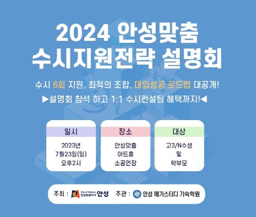 2부에서는 ‘반드시 알아야 하는 안성맞춤 수시 합격을 위한 필요조건’ 이라는 타이틀로 2024학년도 의학계열 ․ 상위 11개 대학 ․ 인서울 대학 ․ 지방 국립대학 ․ 채용계약학과 ․ 교육대학 지원전략 등이 안성메가스터디 기숙학원 대입전략연구소 소장 및 메가스터디 대입 컨설팅센터 전문컨설턴트 신진복 소장의 상세한 설명이 있을 예정이다. 설명회 종료 후에는 Q&A 및 간단한 상담도 병행되며 설명회 참석자 중 추첨을 통해 안성시에 주소지를 두고 있거나 안성소재 학교에 재학중인 고3학생 20명을 대상으로 8월 20일(일) 1:1 컨설팅을 지원한다.