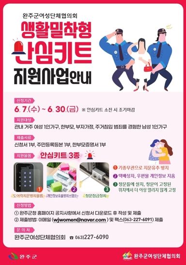 [제주교통복지신문 김강석 기자] 완주군 여성단체협의회가 여성 1인 가구, 한부모 가구, 주거침입 범죄를 경험한 남성 1인 가구에 생활밀착형 안심키트 3종을 지원한다.