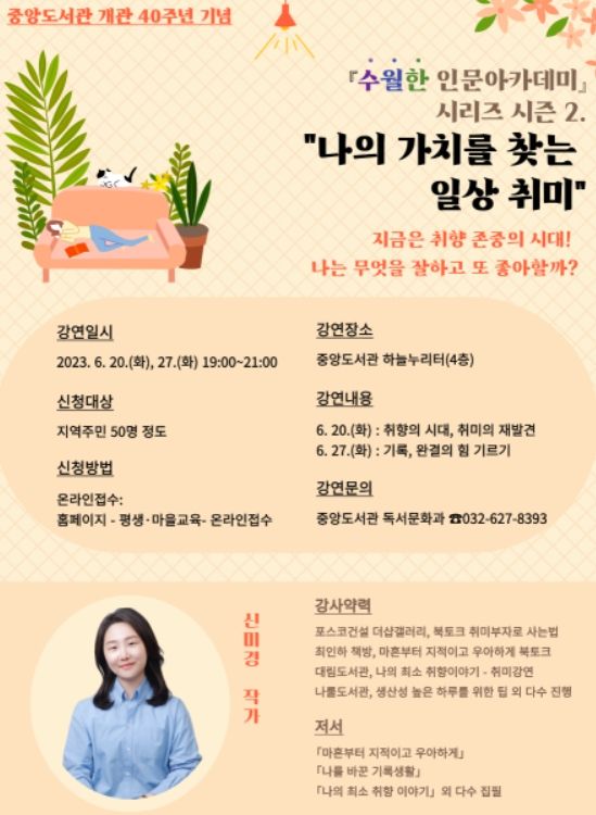 [제주교통복지신문 김강석 기자] 인천광역시교육청중앙도서관은 개관 40주년 기념 '수월한 인문 아카데미' 시리즈의 두 번째 시즌으로 신미경 작가의 ‘나의 가치를 찾는 일상 취미’ 강연을 20일과 27일 저녁 7시 중앙도서관 4층 하늘누리터에서 운영한다.