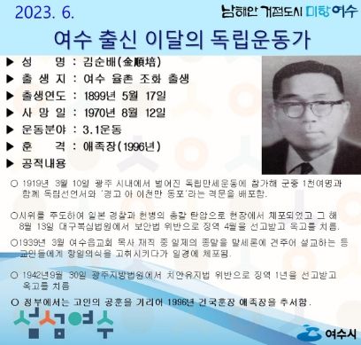 [제주교통복지신문 김강석 기자] 여수시가 6월 호국보훈의 달을 맞아 독립운동가로 여수 율촌 조화 태생 ‘김순배(金順培)선생’을 선정하고 홍보에 나섰다.