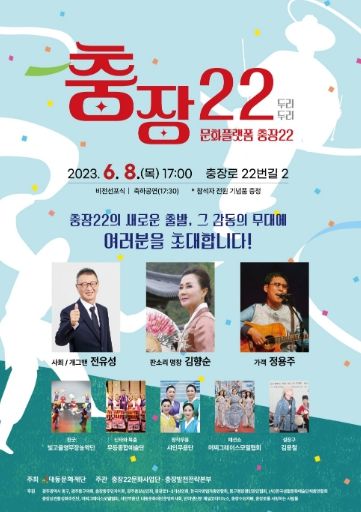 특히 이번 행사에서는 충장22 새 위탁 기관으로 선정된 (사)대동문화재단이 원도심 충장로의 발전을 견인하는 허브 역할을 해온 충장22의 새로운 도약을 위해 다양한 프로그램을 통해 삶의 질을 높이고 지역 사회와 함께 문화를 즐길 수 있는 시민문화마당을 만들어 나가겠다는 결의를 다지는 비전 선포식도 거행할 계획이다.