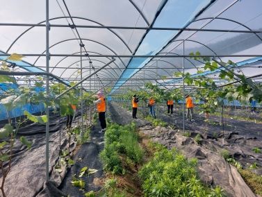 이날 직원들은 이른 아침부터 용전리에 위치한 포도밭에 찾아가 서툴지만 작은 보탬이 되기 위해 포도 순 따기 작업에 최선을 다했다