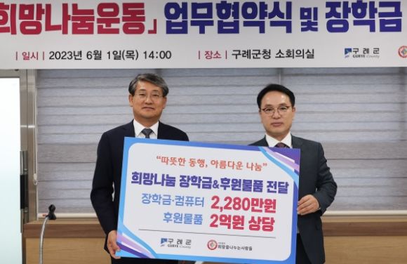 [제주교통복지신문 김강석 기자] 전남 구례군은 지난 1일 군청 소회의실에서 (사)희망을나누는사람들과 ‘희망 나눔 운동’ 업무협약 및 장학금 전달식을 가졌다고 밝혔다.