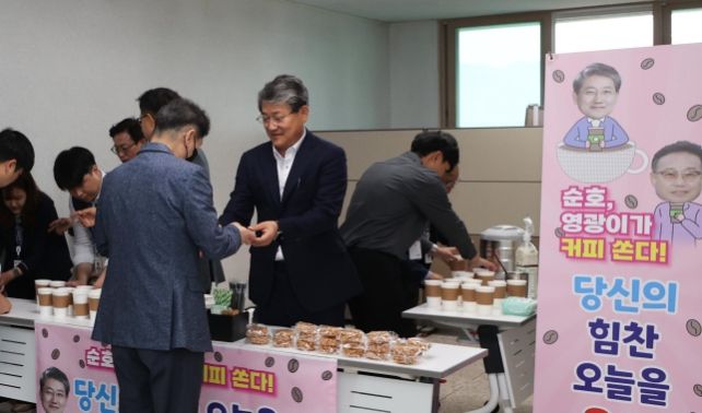 [제주교통복지신문 김강석 기자] 전남 구례군 김순호 군수는 지난 1일 대회의실에서 정례조회에 참석한 직원들에게 커피와 디저트를 전달하는 이색 이벤트를 개최했다.