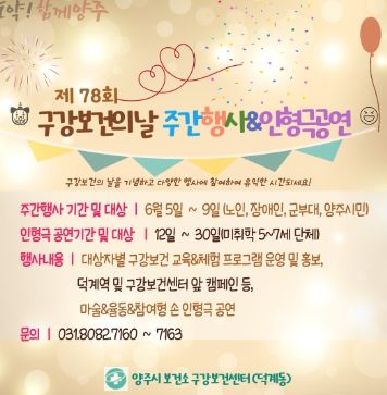 [제주교통복지신문 김강석 기자] 양주시 구강보건센터에서는 9일 제78회 구강보건의 날을 맞이해 6월 한 달 동안 다채로운 행사를 진행한다.