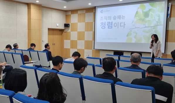 배정애 청렴교육 전문강사를 초빙한 이번 교육은 이해충돌방지법, 공익신고, 갑질 예방을 주제로 2시간 동안 진행됐으며, 이해충돌방지법 시행 1년이 지난 시점에서 신고 의무 및 금지 행위 기준을 다시 한 번 되짚어보고 공익신고 실제 사례를 들으며 공익신고가 갖는 긍정적인 사회적 변화를 체감하는 시간을 가졌다.