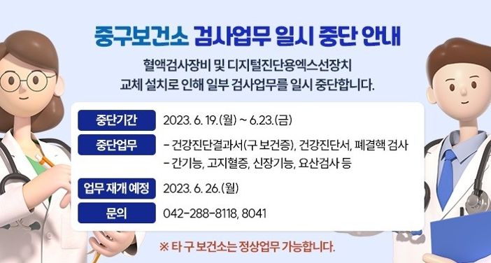 중구보건소는 중단 기간 중 긴급하게 검사 또는 제증명 발급이 필요한 경우, 타구 보건소에서 업무를 처리해 줄 것을 간곡히 당부했다. 관련 문의는 중구보건소로 하면 된다.