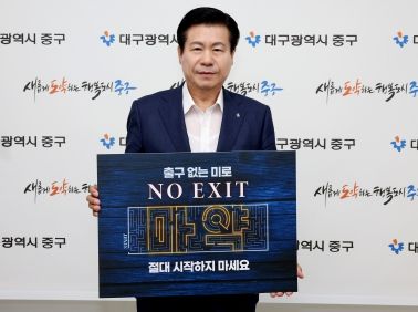 [제주교통복지신문 김강석 기자] 류규하 대구 중구청장은 ‘유명 연예인의 마약 사건’ 및 ‘강남 학원가 마약음료 사건’으로 마약 범죄의 심각성이 드러난 가운데, 마약의 무서움에 대한 경각심을 환기하여 마약 투약・중독을 미연에 방지하고자 ‘NO EXIT’캠페인에 동참했다.