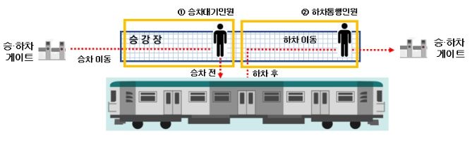 실시간 교통카드 승하차 정보, 역별 지하철 출발·도착 시간, 역별 승강장 면적 등의 데이터를 토대로 실시간 승강장 체류 인원과 밀집도를 도출하여 혼잡수준을 판단한다.