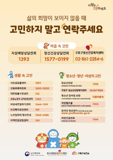 구로구 관계자는 “자살을 생각하는 구민이 있다면 언제 어디서나 도움을 받을 수 있도록 홍보활동을 강화해 나가겠다”며 “자살 예방 활동에 더욱 많은 주민들이 관심을 갖고 참여해주시기를 희망한다”고 말했다.