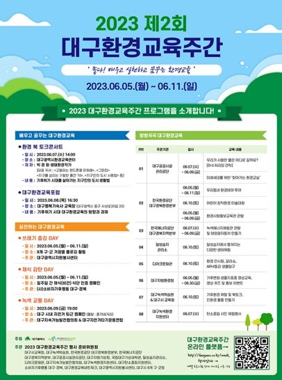 이번 환경교육주간은 대구광역시와 대구광역시환경교육센터가 주최하고, 지역내 30여개 환경교육 기관·단체가 참여하여 ‘배우고 실천하고 꿈꾸는 환경교육’을 슬로건으로 다채로운 교육 행사를 진행한다.