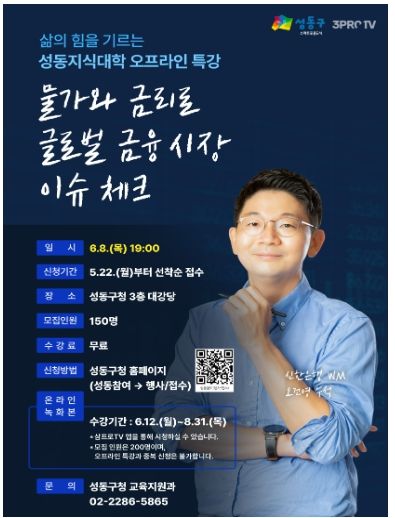 [제주교통복지신문 김강석 기자] 서울 성동구가 오는 8일 오후 7시 구청 3층 대강당에서 성동지식대학 ‘물가와 금리로 글로벌 금융시장 이슈 체크 특강'을 개최한다.