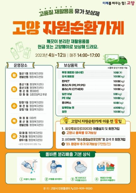 [제주교통복지신문 김강석 기자] 고양특례시는 재활용품을 현금으로 보상하는 자원순환가게를 전년도 7개소에서 올해 14개소로 확대 운영하고 있다.