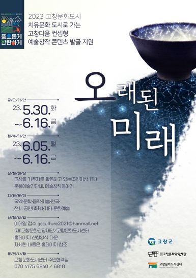 [제주교통복지신문 김강석 기자] 고창문화도시센터가 2023년 고창문화도시 ‘치유문화도시로 가는 고창다움 컨셉형 예술창작 콘텐츠 발굴’ 신청자 모집에 나섰다.