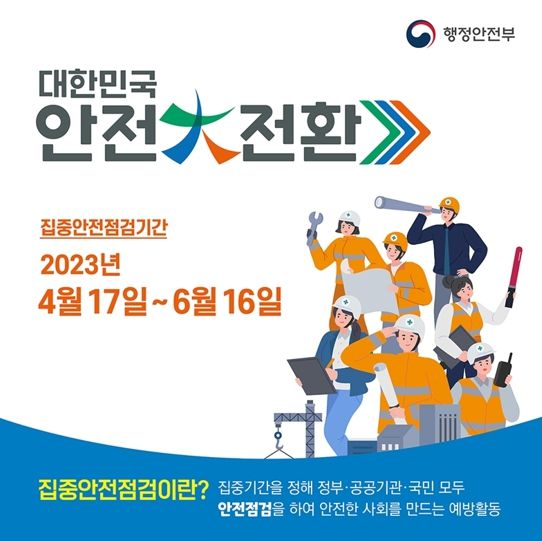 ‘대한민국 안전大전환’은 중앙행정기관부터 지방자치단체, 공공기관, 민간 전문가, 국민 모두가 안전관리의 주체가 돼 안전관리가 필요한 시설과 생활 속 위험 요소를 집중적으로 점검하고 안전관리 실태를 개선하기 위한 재난 예방 활동이다.