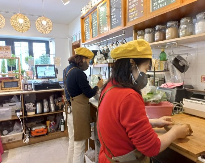 ‘숲마실카페’는 사회적기업 ㈜지엔그린이 맡아 운영하고 있으며, 이곳에서 전문 교육을 수료한 12명의 시니어 바리스타들이 활동하고 있다.
