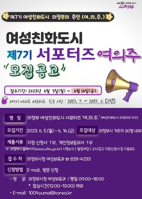 [제주교통복지신문 김강석 기자] 의정부시는 제7기 여성친화도시 서포터즈 ‘여의주(여성친화도시 의정부의 주인)’를 6월 16일까지 모집한다.
