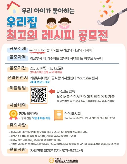 [제주교통복지신문 김강석 기자] 의정부시에서 지원·관리하는 어린이급식관리지원센터가 ‘우리집 최고의 메뉴’ 공모전을 6월 1일부터 16일까지 16일간 실시한다.