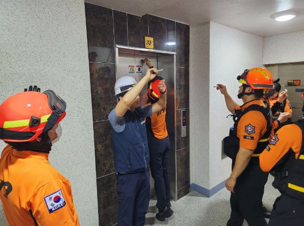 이번 승강기 사고 대응 인명구조훈련은 승강기 전문기관인 한국승강기안전공단(전남서부지사)과 합동으로 소방 25명, 한국승강기안전공단 3명 등의 직원들이 참여했다.