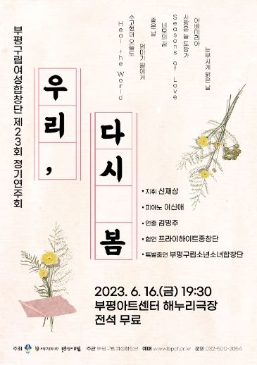 [제주교통복지신문 김강석 기자] 부평구립여성합창단이 오는 16일 부평아트센터 해누리극장에서 제23회 정기연주회 ‘우리, 다시 봄’을 연다.