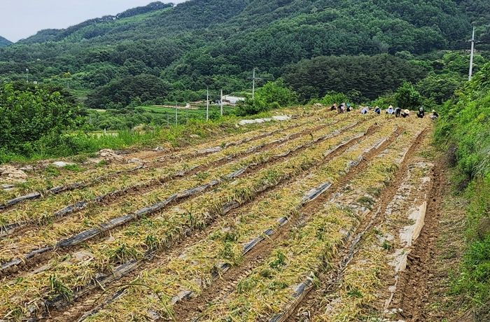 5일 군 민원지적과 직원 12명은 아침 일찍부터 묘산면의 마늘 농가를 방문해 마늘 수확에 구슬땀을 흘렸다.
