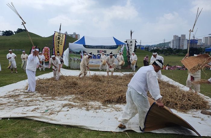 이후 유네스코 세계문화유산으로 등재 추진 중인 소가야의 역사가 살아 있는 송학동고분군에서 펼쳐진 마당공연에서는 물레공연, 삼삼기 공연, 보리타작 공연과 현장 공연으로 모내기와 논매기 공연이 펼쳐졌다.
