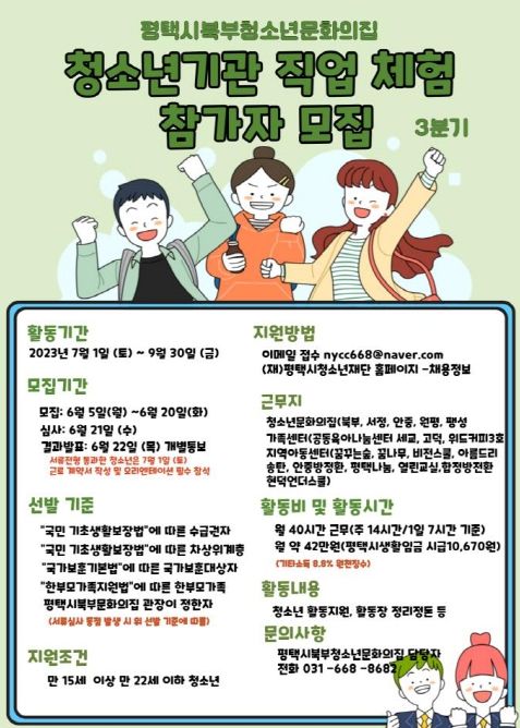 [제주교통복지신문 김강석 기자] (재)평택시청소년재단 북부청소년문화의집에서 ‘2023년 3분기 청소년기관 직업체험활동’에 참가할 청소년을 모집한다.